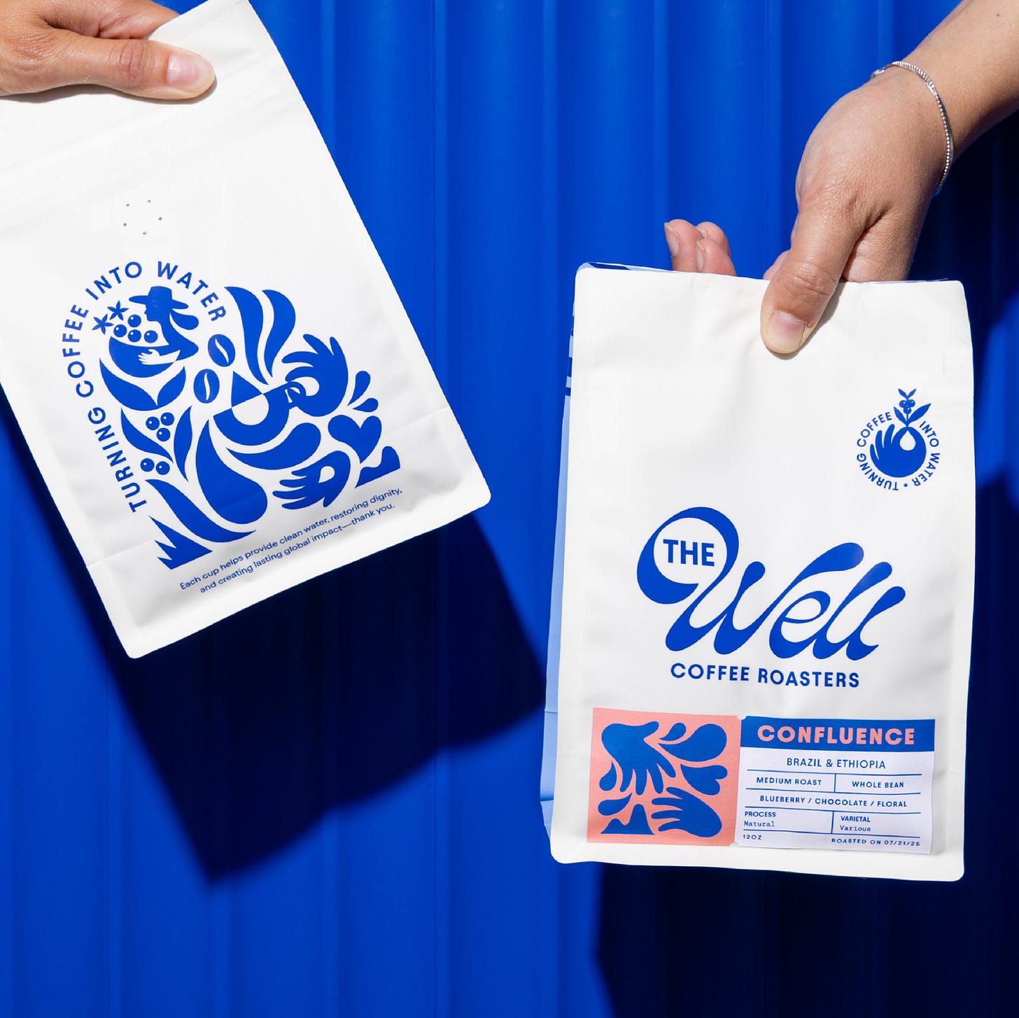 The brand identity mirrors this purpose. Working with Carpenter Collective, The Well created a visual system shaped by water as a unifying idea. A fluid wordmark, a calm blue and white palette and a flexible illustration approach appear across cups, bags and signage. The design fits easily into the specialty coffee world while staying warm, open and approachable.