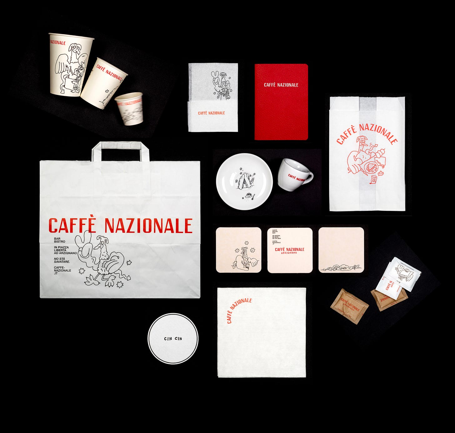 The typographic foundation of the identity is drawn directly from the Italian streets around the dazzlingly beautiful 19th century piazza on which Caffè Nazionale is sited: references include panini vans, parking signs, salumerie food store fronts, barbershops, laundries, pizzerias, and car repair workshops – it’s all about that vernacular approach to ensure Caffè Nazionale’s identity feels not like the launch of a snazzy new Instagrammable brand/‘destination’, but something that’s always been part of the fabric….